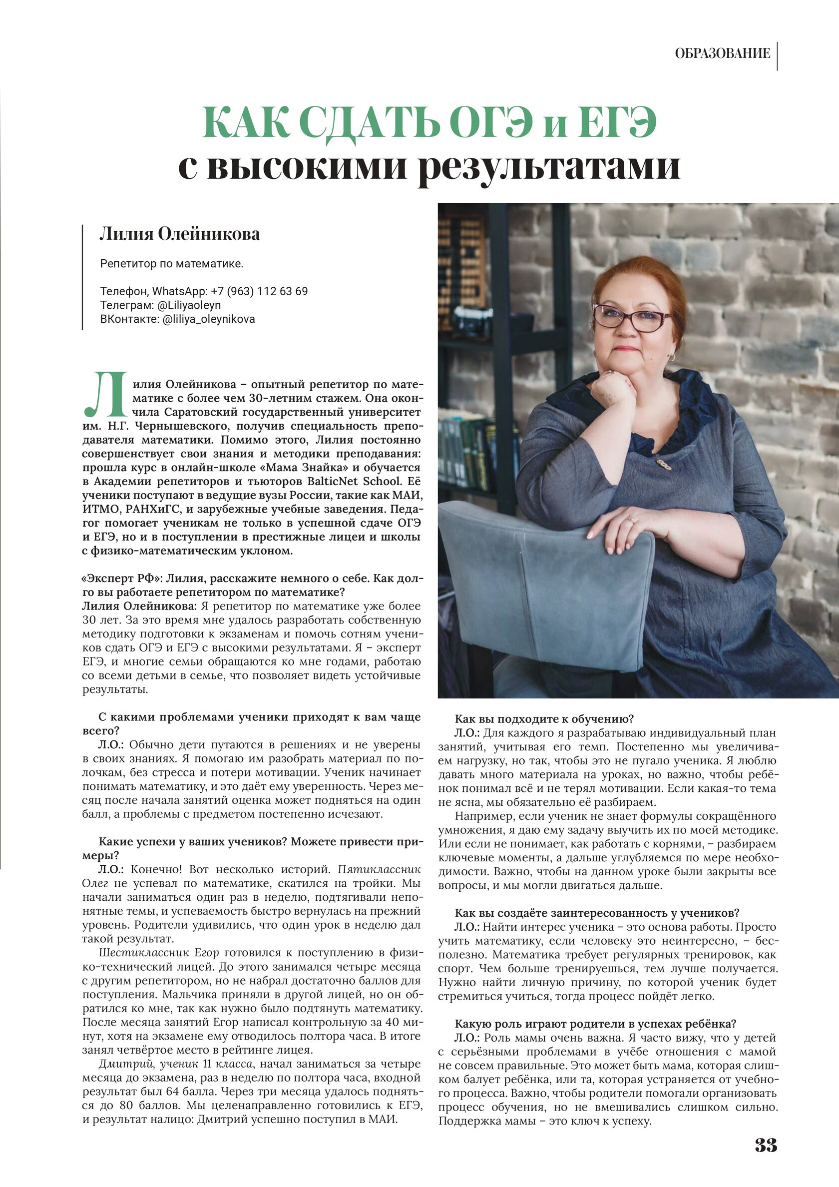 Меня зовут Лилия Олейникова, я репетитор по математике с более чем 30-летним опытом работы. Разработала свою методику подготовки к экзаменам и на протяжении многих лет обучаю не только отдельных учеников, но и целые семьи.